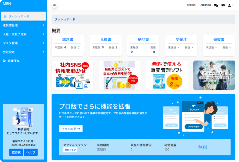| 1ヵ月の請求書送信可能数 | 100 | 200 | 500 | 1000 | 5000 | 制限なし |